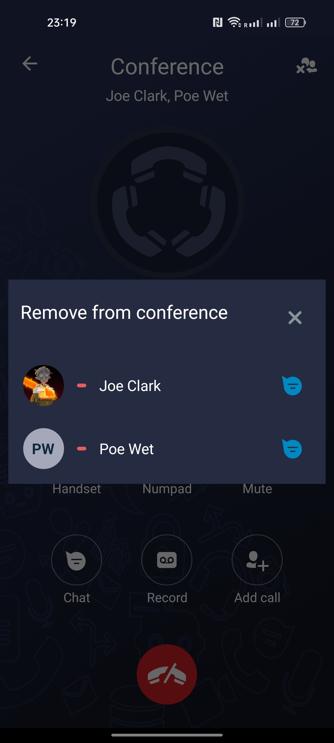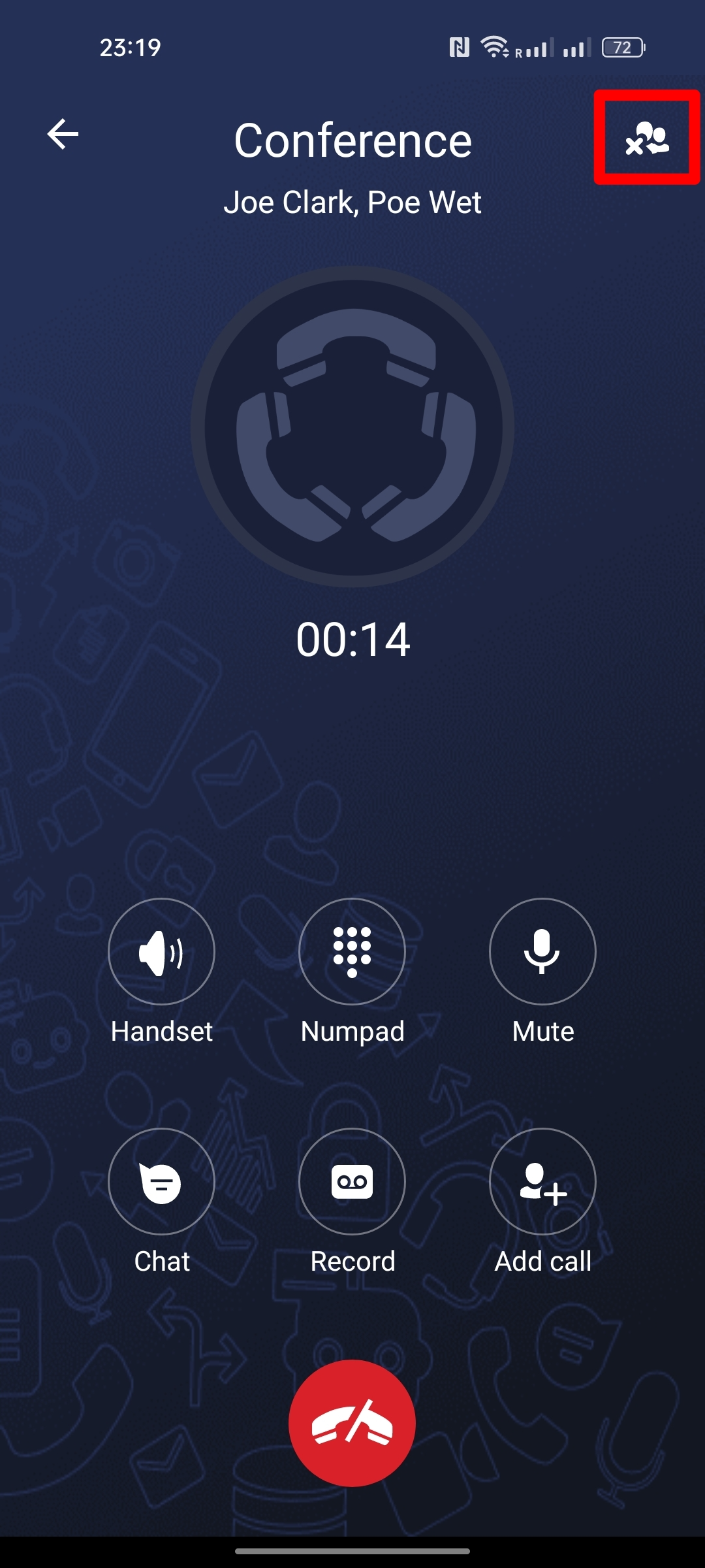 - During an ongoing conference call, tap on the “Remove participant” button at the top-right corner of the app to open the list of participants.