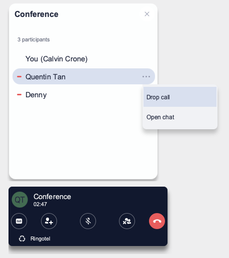 2. In the participant list, hover over the user or contact you want to disconnect from the conference, then click the three dots and in the opened menu select Drop call.